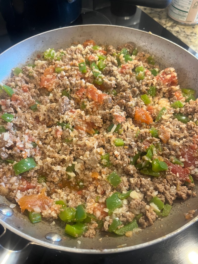 - Mix it all together: Add cauliflower rice, stewed tomatoes, Italian seasoning, salt, and pepper. Stir well and let simmer for 10 minutes so flavors blend.